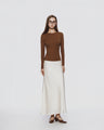 Featuring a clean round neckline and streamlined long sleeves, this versatile piece transitions effortlessly from everyday wear to polished styling when paired with silk skirts or tailored trousers.