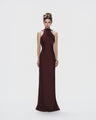 The halter neckline delicately highlights the shoulders and collarbone, while the elongated, figure-skimming cut enhances height and elegance. Finished in a deep burgundy tone, this gown embodies quiet luxury and effortless sophistication.